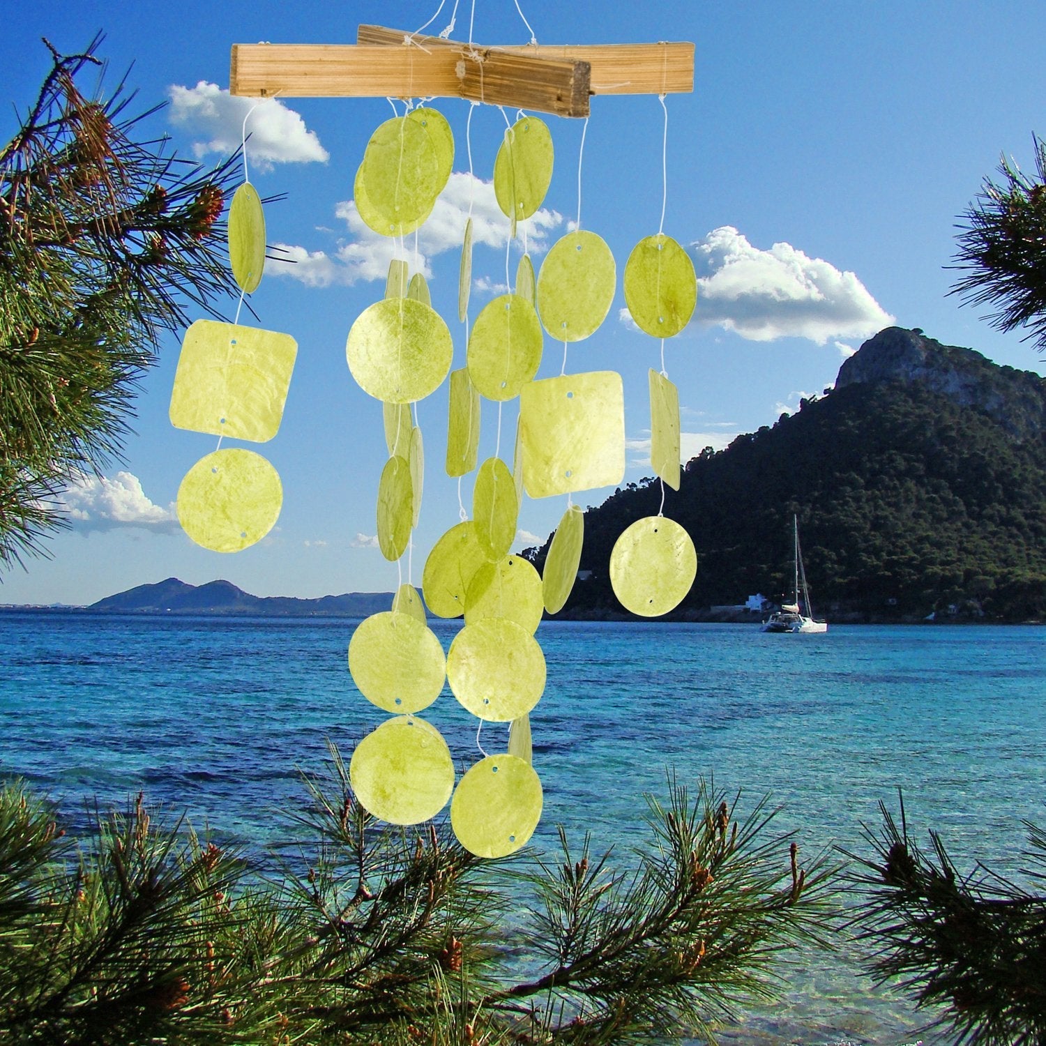 Our handcrafted capiz wind chimes are made by Balinese artisans. Hand strung and hand dyed, these chimes are made of natural, renewable materials. When touched by the wind, your chime will produce a delicate tinkling musical sound.