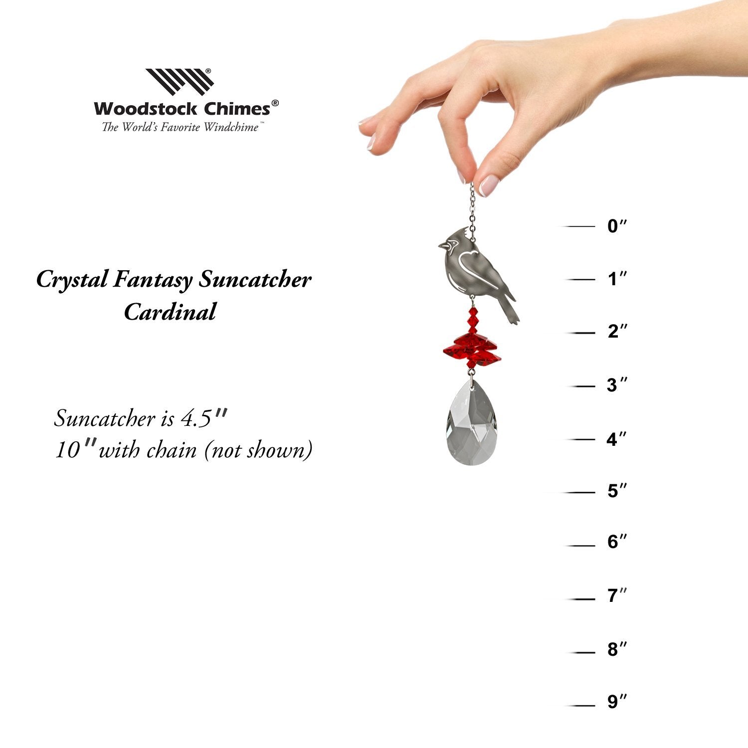 A large crystal is topped by smaller crystals and a silver Northern cardinal.