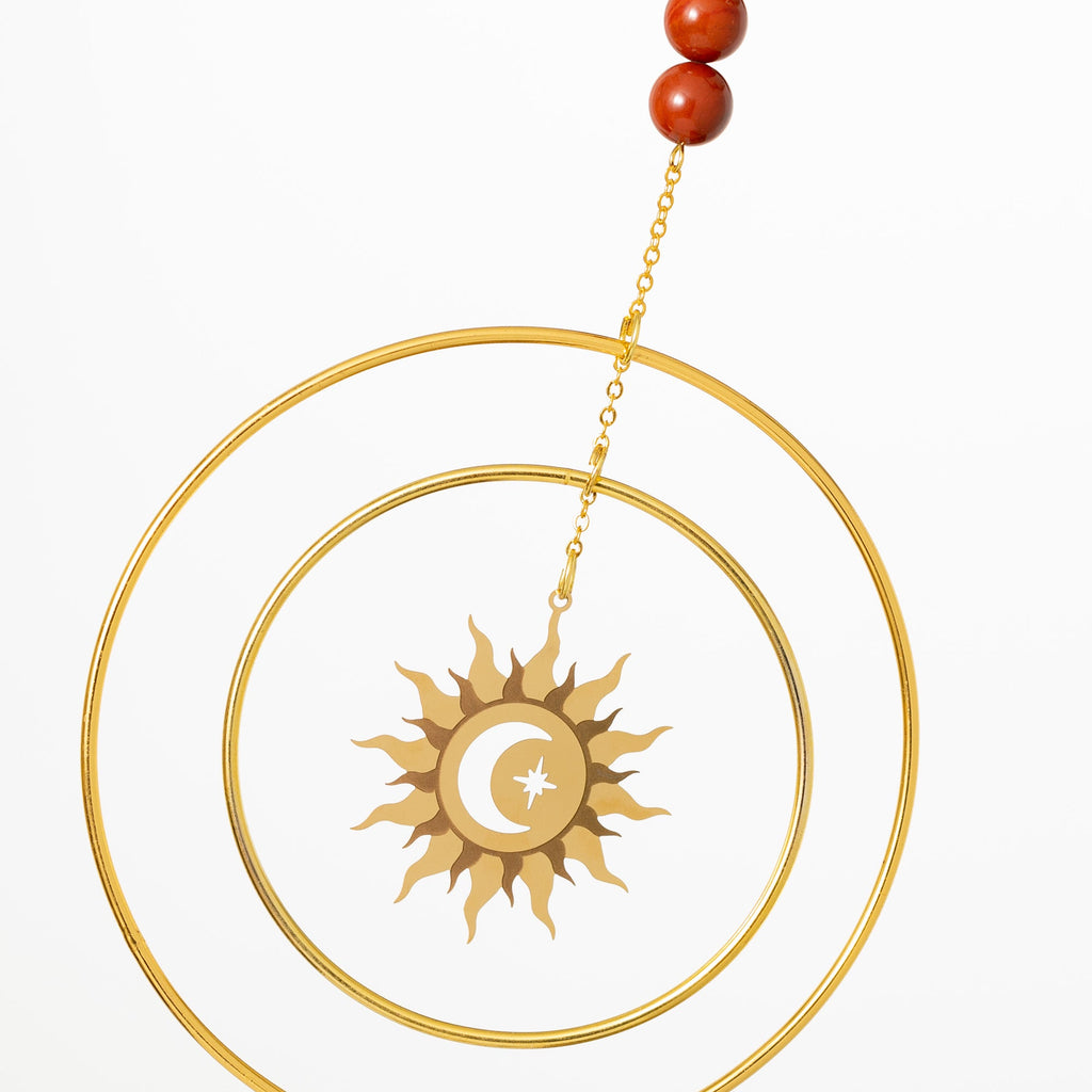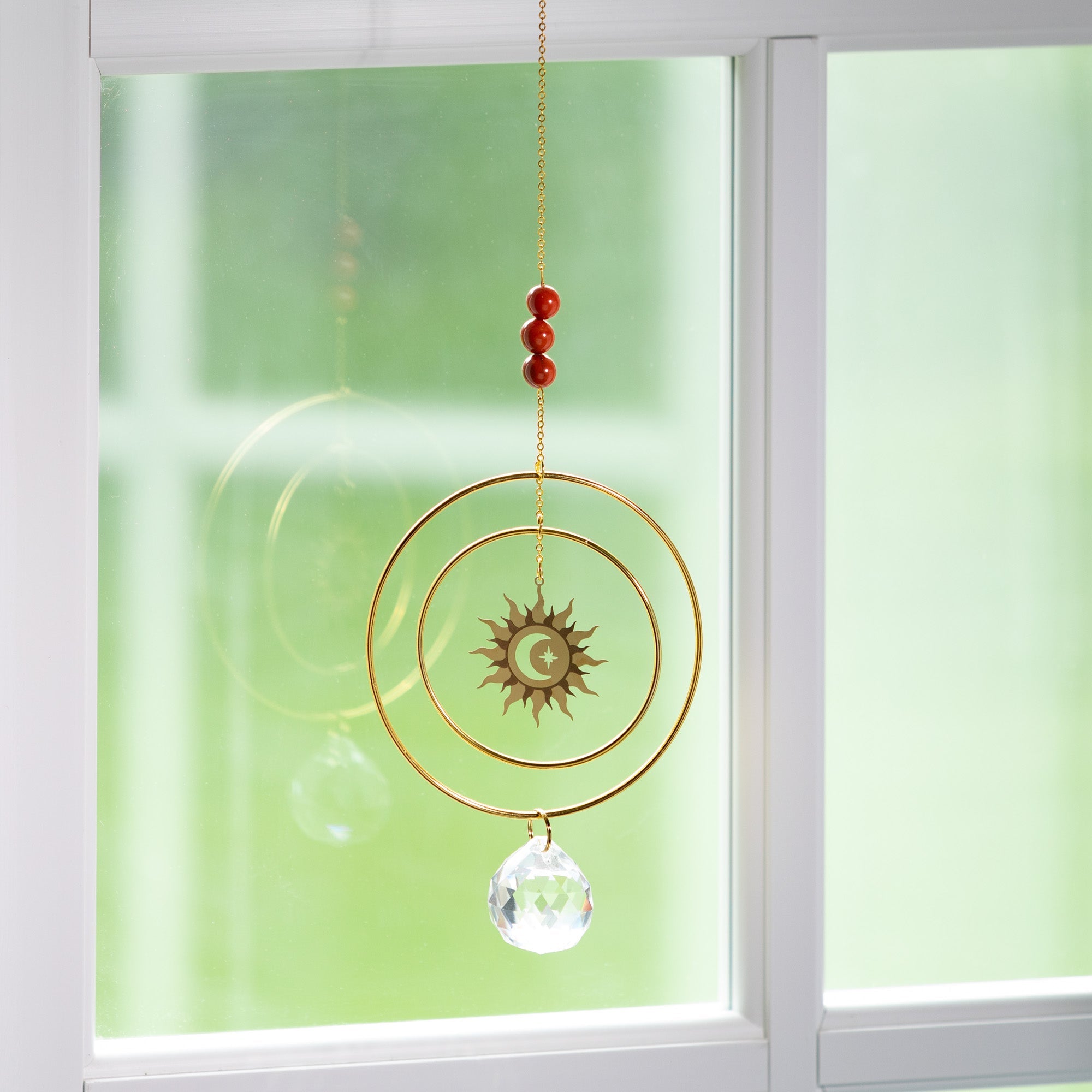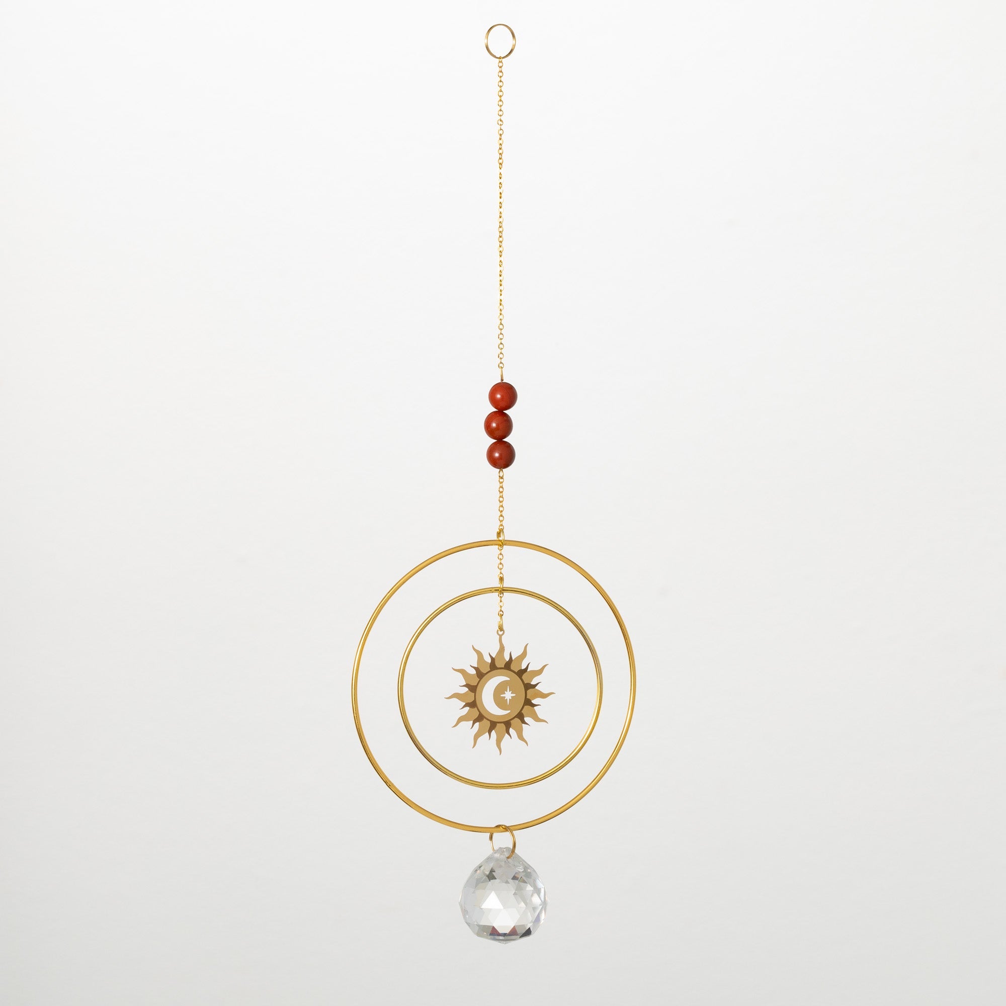 Illuminate your space with the brilliance of this radiant sun suncatcher. At its center, a striking sun hangs elegantly within concentric gold-tone rings, embodying celestial charm and timeless elegance. A faceted crystal prism dangles below, catching sunlight to scatter vibrant rainbows across your room. The suncatcher is accented with three red stone beads, suspended along a delicate gold chain. Perfect for brightening windows, enhancing sacred spaces, or as a thoughtful gift, this piece brings a touch of cosmic wonder and uplifting energy to any setting.