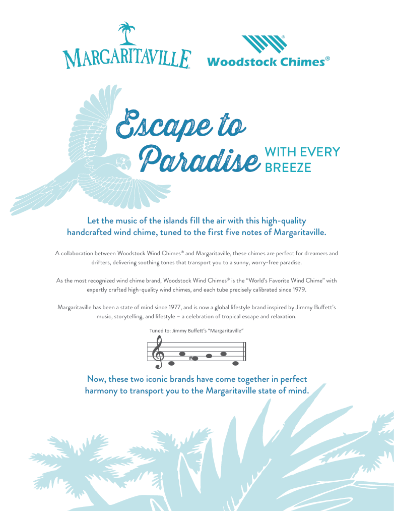 Escape to paradise with the Woodstock Chimes Signature Collection Blue Margaritaville Parrot Chime ?€? 40"", a tropical-inspired windchime tuned to the opening notes of Jimmy Buffett?€?s timeless hit, Margaritaville. Part of a licensed collaboration between Woodstock Chimes and Margaritaville, this chime blends island vibes with quality craftsmanship for a relaxing outdoor sound experience. Designed with a paint-washed ash wood top and clapper, the chime has a sun-weathered look that pairs beautifully with the soft, seaglass blue powder-coated aluminum tubes. A painted resin feather acts as the windcatcher, featuring the iconic Margaritaville parrot in full color?€?making this piece a musical and visual centerpiece for your porch, patio, garden, or lanai. At 40 inches long, it delivers rich, resonant tones and a bold decorative presence. Arrives in a Margaritaville-branded kraft gift box, ready for gifting to beach lovers, Parrotheads, and anyone who craves a little peace, music, and sunshine.