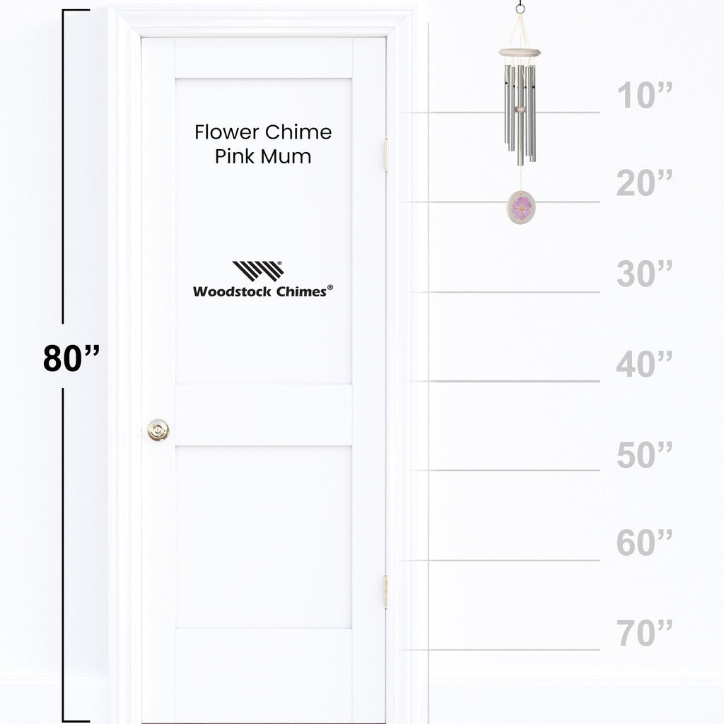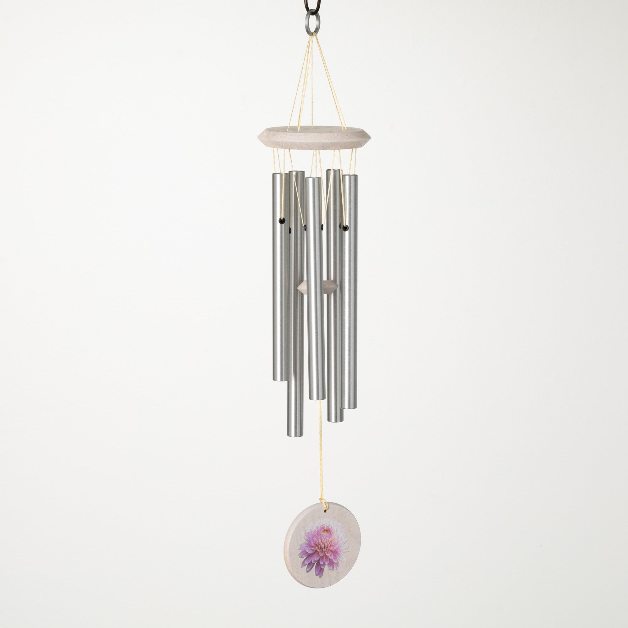 Bring the beauty of nature to your outdoor space with this eye-catching Flower Chime from Woodstock Chimes. Crafted from aluminum and silver with washed white wood, it features a charming floral graphic on the feather. But the real magic begins when a gentle breeze blows through, setting the hand-tuned aluminum tubes dancing. Listen closely and you'll hear delightful, random melodies in a soothing pentatonic scale. Perfect for hanging from a covered patio, front porch, or in your garden, this Pink Mum Flower Chime lends an upscale, decorative touch while providing the calming sounds of nature's symphony. Let it be a reminder to slow down and enjoy life's simple pleasures.
