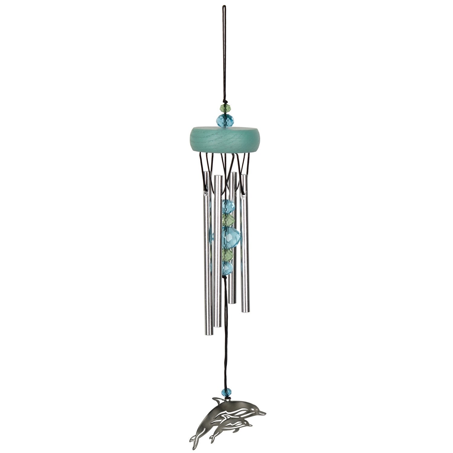 Delicate chiming combines with sparkling crystals and motifs from nature and mythology to enchant and delight. Playful silver dolphins act as the wind catcher (or, if you will, dreamcatcher) of this chime. Blue and green crystals embellish the chime, reminiscent of the sunwashed colors of the seashore.