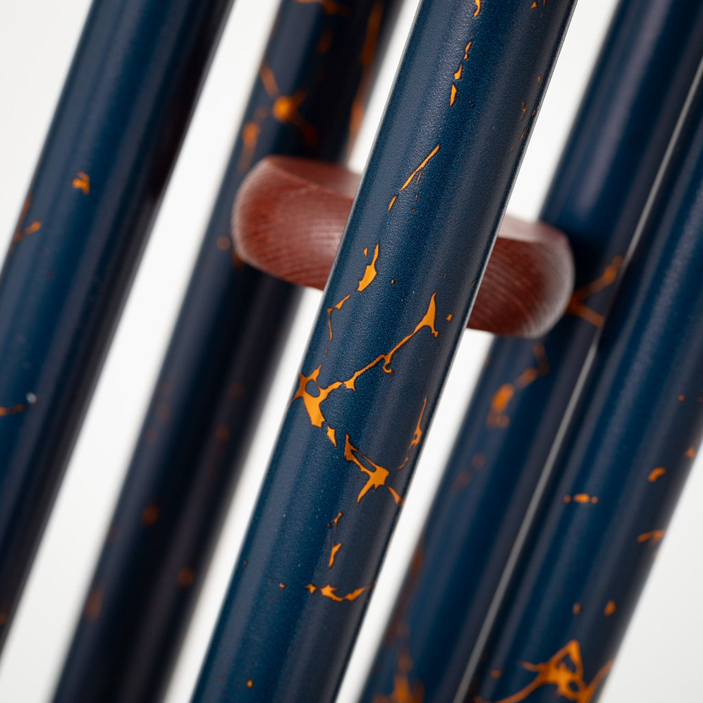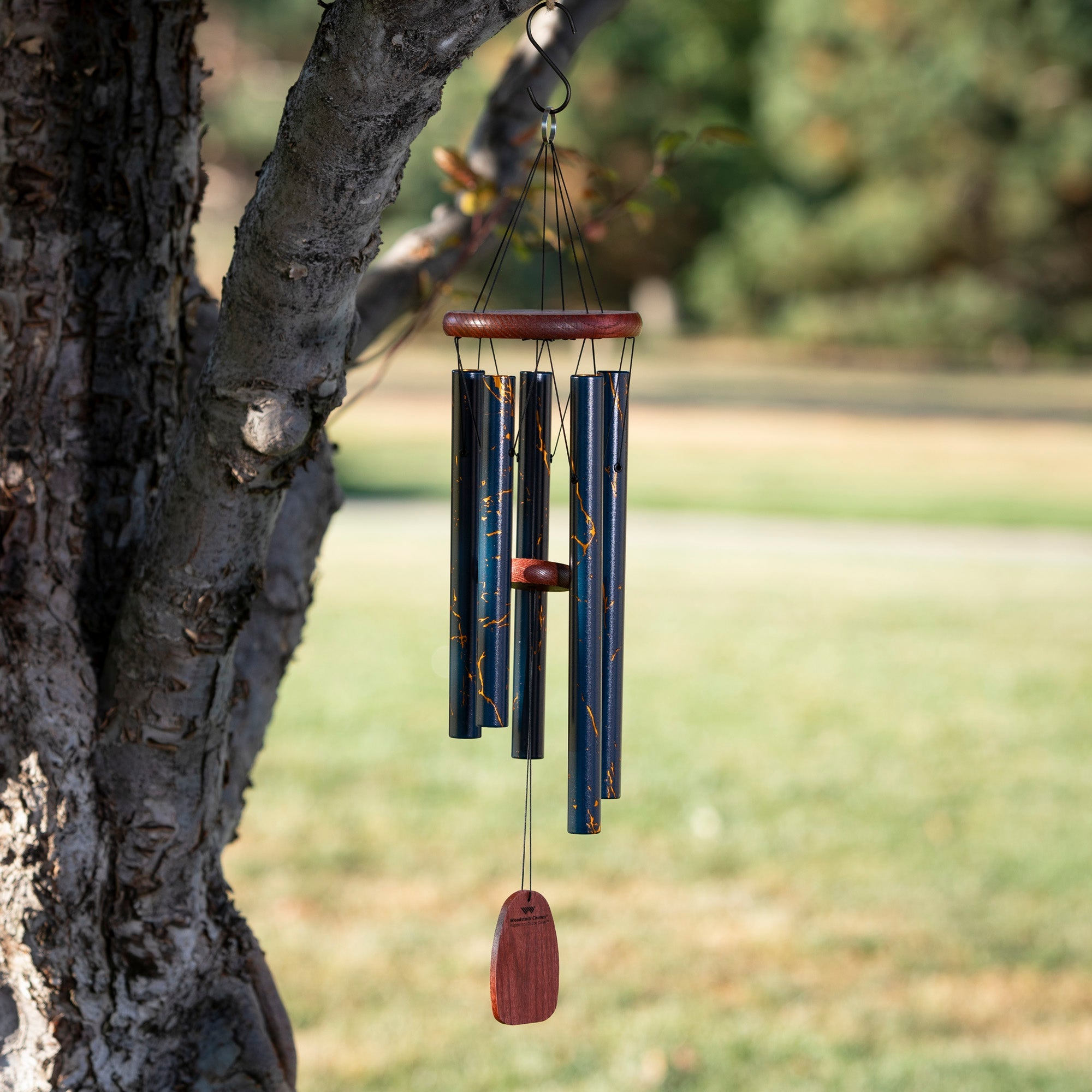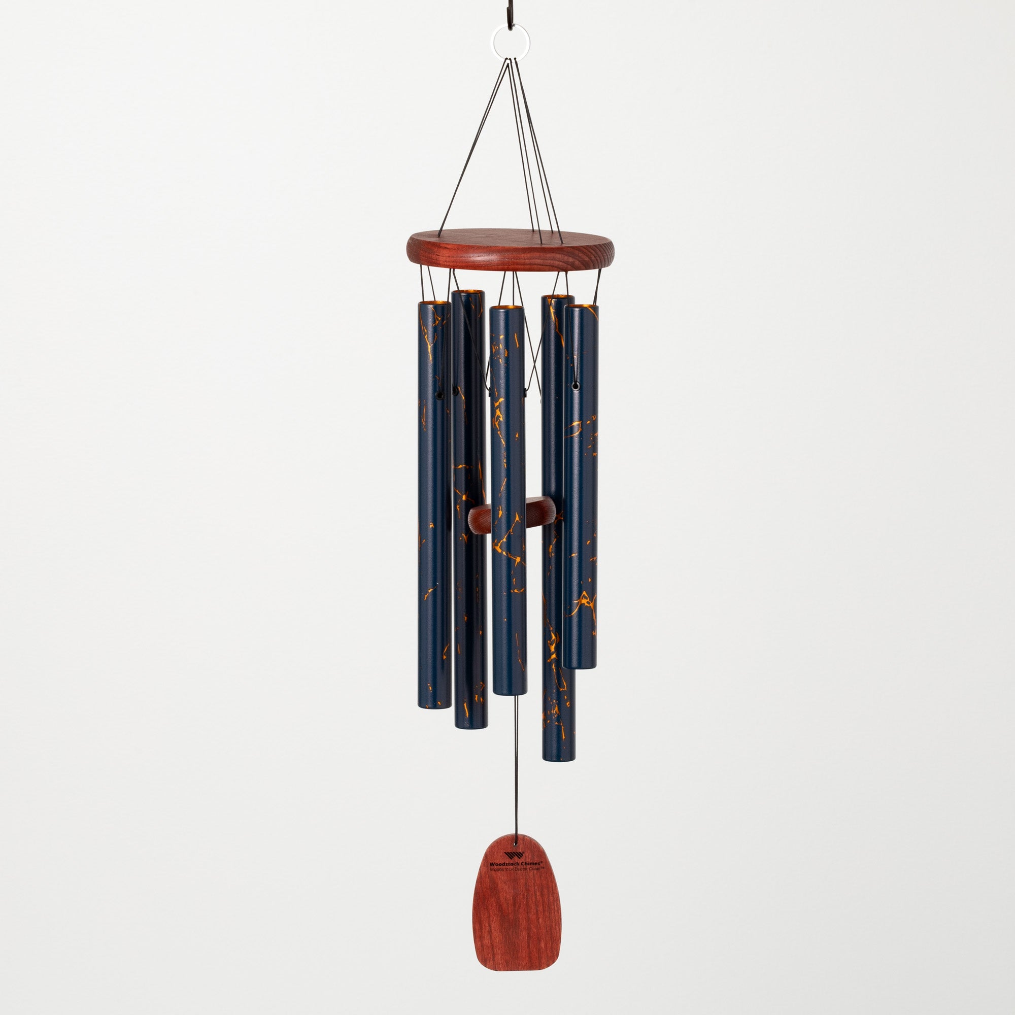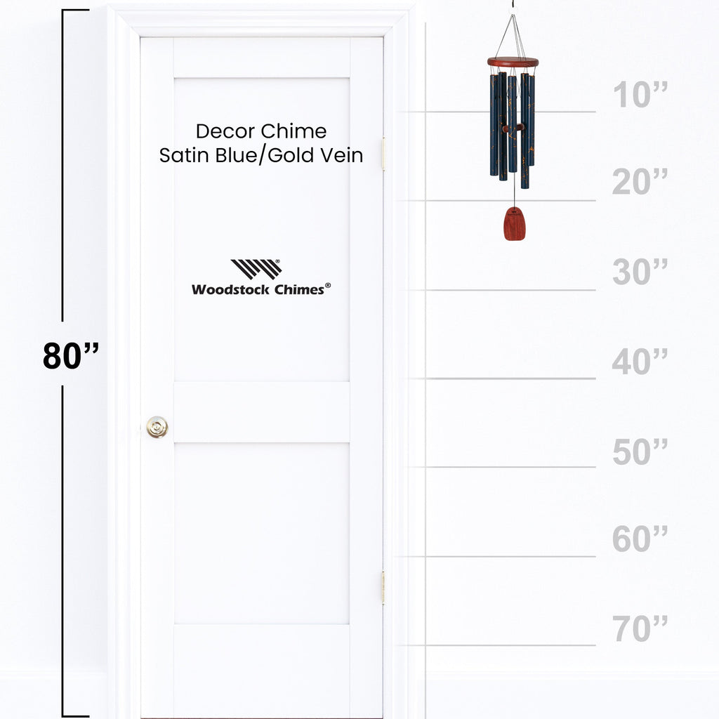 Elevate your outdoor oasis with this Satin Blue/Gold Vein Woodstock Décor Chime. Crafted from aluminum with a luxurious UV satin blue finish veined in shimmering gold, it evokes the precious beauty of gold - the most coveted element on earth. But the real magic happens when a gentle breeze sets the tuned aluminum rods singing an ancient pentatonic scale. Let the soothing, mystical tones envelop you, transporting you to a state of tranquil zen as this stunning decorative chime adds visual and aural elegance to your garden, patio or backyard sanctuary. Bring home the harmonious chime of the ages from the masters of wind chimes at Woodstock.