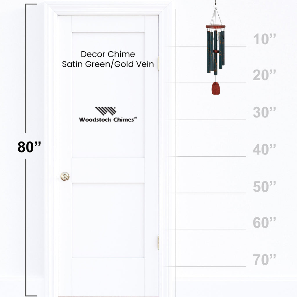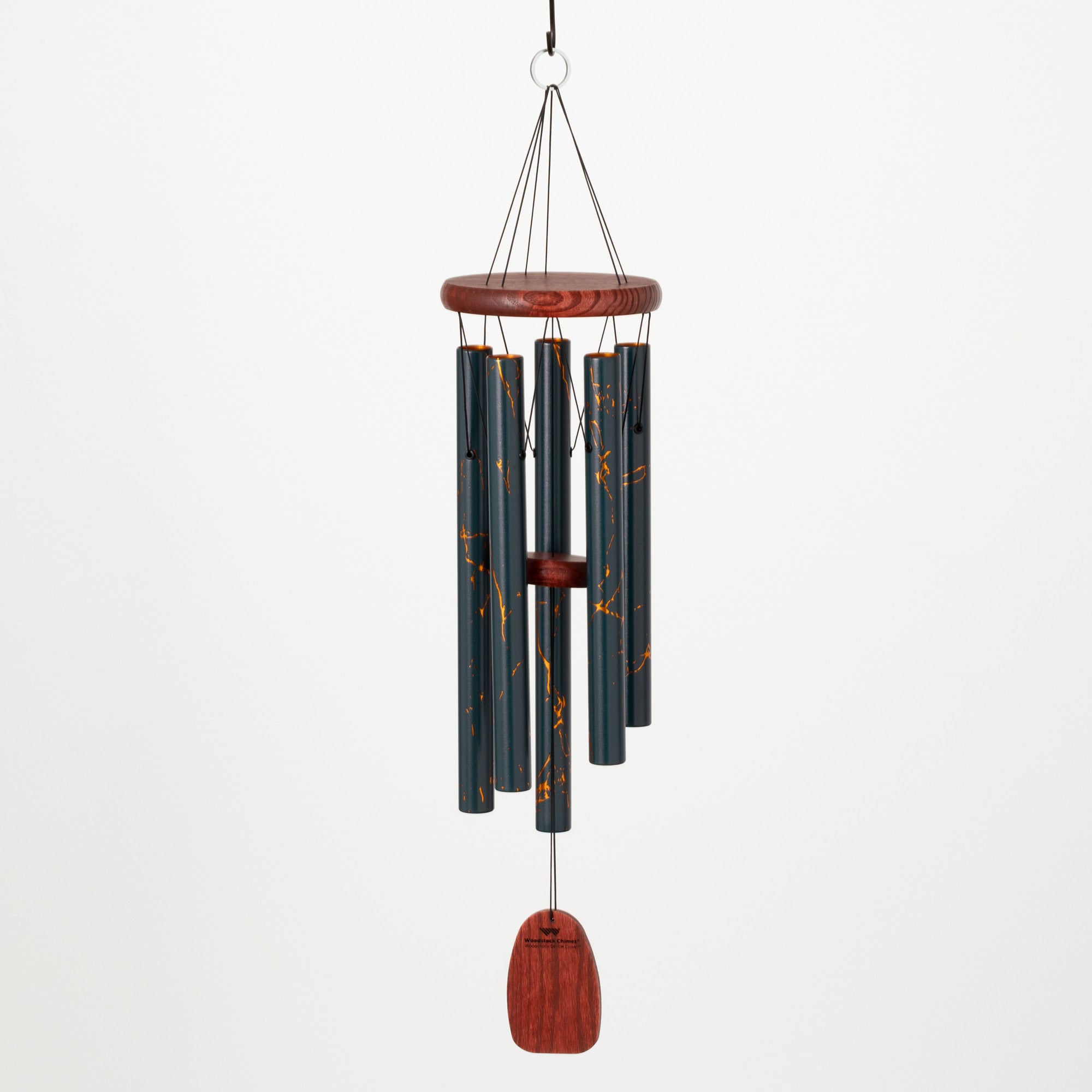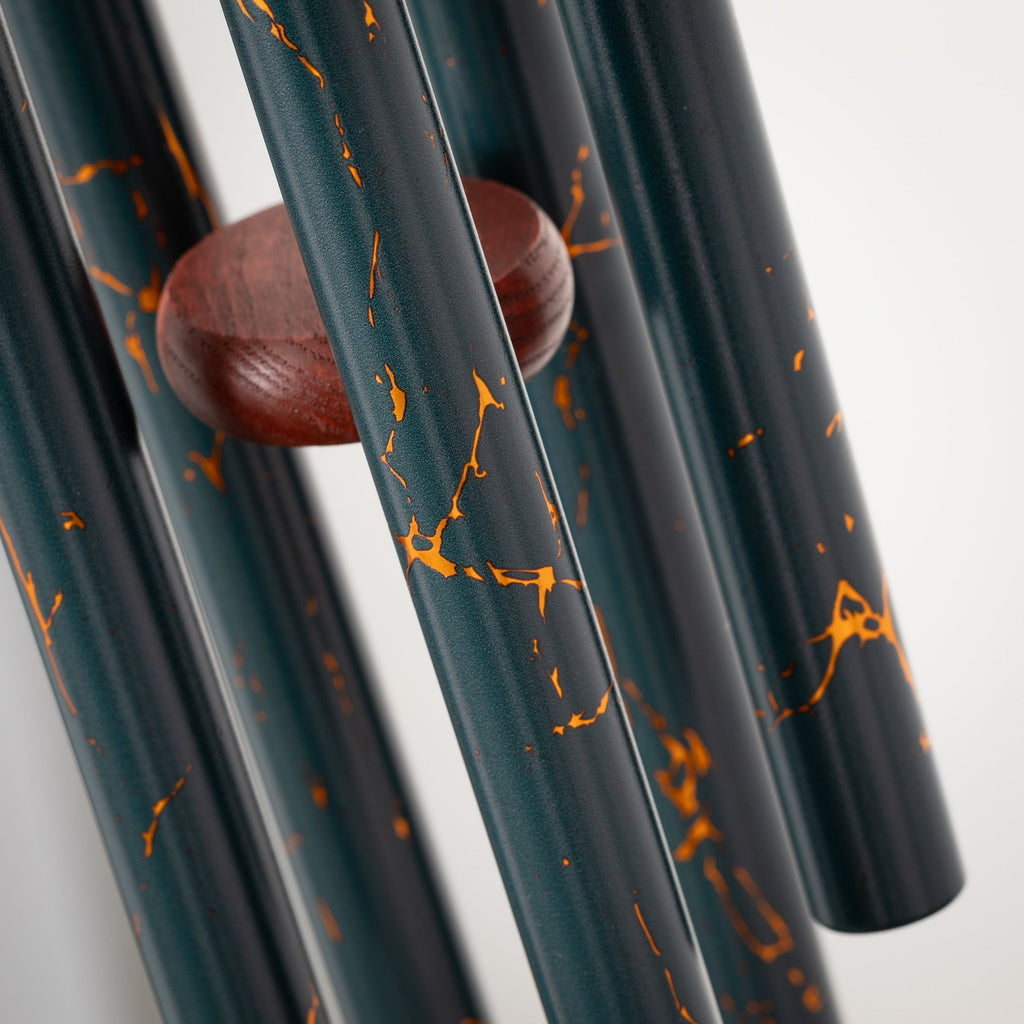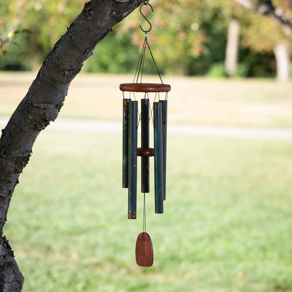 Ancient sounds meet modern artistry. This aluminum Woodstock Chime melds meditative pentatonic tones with satin green hues veined in lustrous gold. Handcrafted using intricate UV printing techniques, each decorative tube evokes gold's natural beauty and preciousness - the most coveted element on earth. Yet it's the tuning that truly transports. Crafted to an ancient pentatonic scale, the chime's soothing notes invite a state of transcendent calm. Hang it indoors and let a breeze summon a sense of inner peace. With its mahogany finish and artful colors, this isn't just a chime- it's a piece of functional decor that doubles as a mindfulness tool. Bring the serenity of ancient sounds into the modern home.