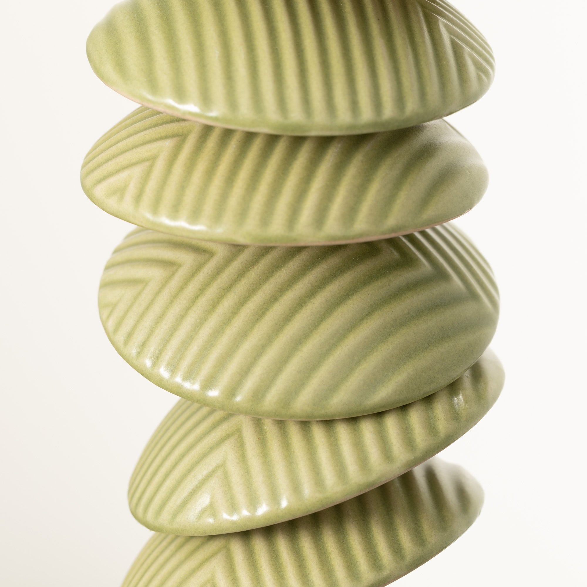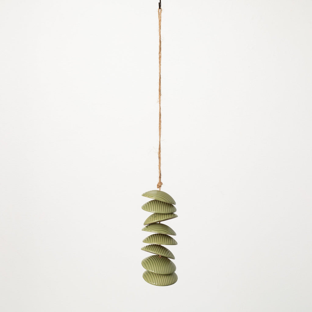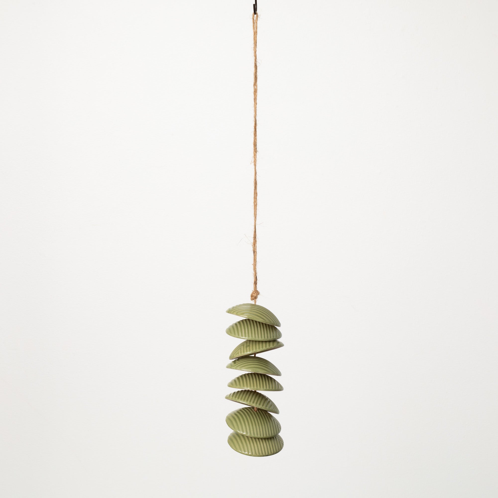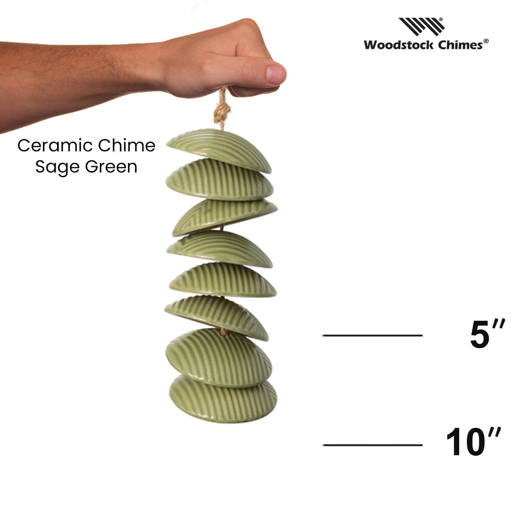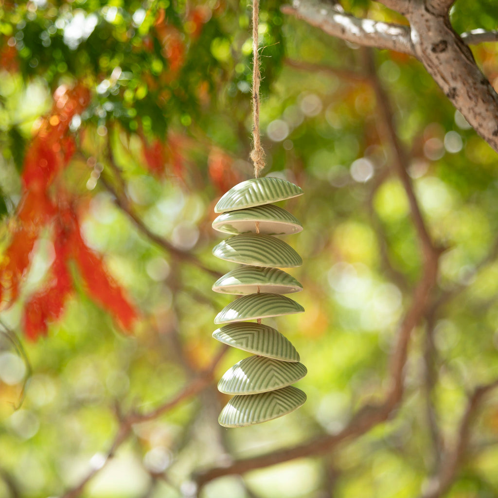 Bring tranquility home with this sage green ceramic chime. Seven hand-painted ribbed disks in a glossy finish create a modern, decorative accent for your indoor or outdoor space. As the sculpted stoneware clay disks sway gently in the breeze, they produce a soft aura of calm. Hang this decorative ceramic chime from its rustic 18" jute rope and allow the gentle sounds to relax you. For more audible effects, hang two or more ceramic chime sets right next to each other for layered ambiance.